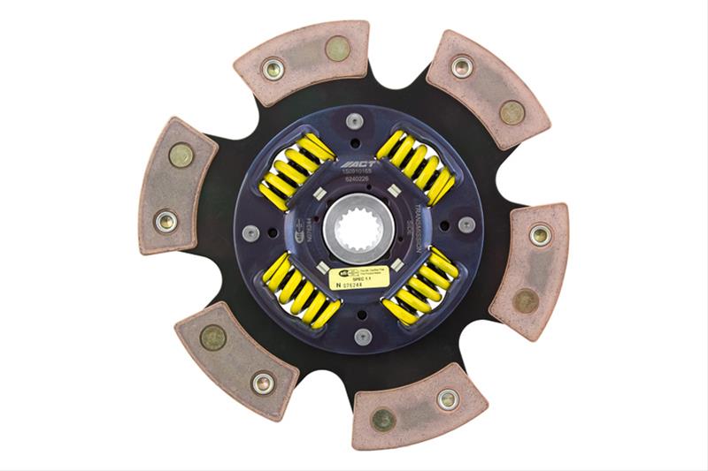 ACT race clutch discs are available in three distinct styles--choose the options that best suit your application. Spring-centered discs are the most popular and feature reduced driveline shock and spline wear with quieter operation. Rigid-hub versions offer improved durability but increase gear noise and spline wear. For either of those hub designs, you can choose six pads for better heat management and engagement, or four pads for the quickest shifting. Sintered iron discs offer the highest torque capacity and ultra-high heat capacity. They're designed for cars using clutch-less shifting or drag racing transmissions.