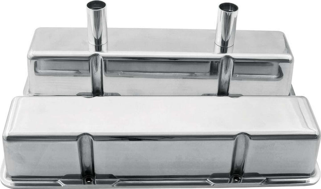 These Allstar Performance cast aluminum valve covers feature two 1 3/8 in. baffled breather tubes on one side and none on the other. They are manufactured from high-quality aluminum and have a polished finish. Their thicker design offers improved gasket sealing and a built-in spreader for secure mounting.Brand: Allstar Performance