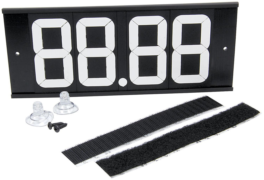 Allstar Performance ET dial-in boards are a great alternative to messy shoe polish when displaying your ET dial-in. Highly visible 3 in. tall white numerals help to ensure correct times are entered at the tower. Each numeral has seven pivoting sections that are easily changed to quickly adjust dial-in time. Allstar boards are available for 3- or 4-digit with mounting holes to fit a standard dial-in board bracket or 4-digit with suction cups and hook/loop tape.