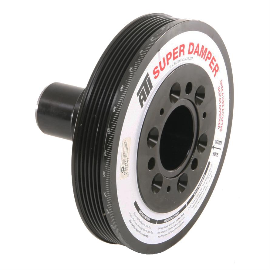 ATI Super Damper Serpentine Series harmonic balancers are patented and feature grooves for serpentine belts machined into the outer damper shell. The dampers come with six outer grooves for standard OEM drive systems—but eight and 10 grooves are available for supercharger or turbo applications. Serpentine dampers are offered in a variety of diameters, and crank hubs may be fitted with a 6-groove serpentine pulley to drive external oil pumps or vehicle accessories. The Serpentine Series Super Dampers fit all ATI GM-front crank hubs and can be adapted to many engine combinations, providing maximum flexibility. They're available in steel or lightweight, hardcoated aluminum.