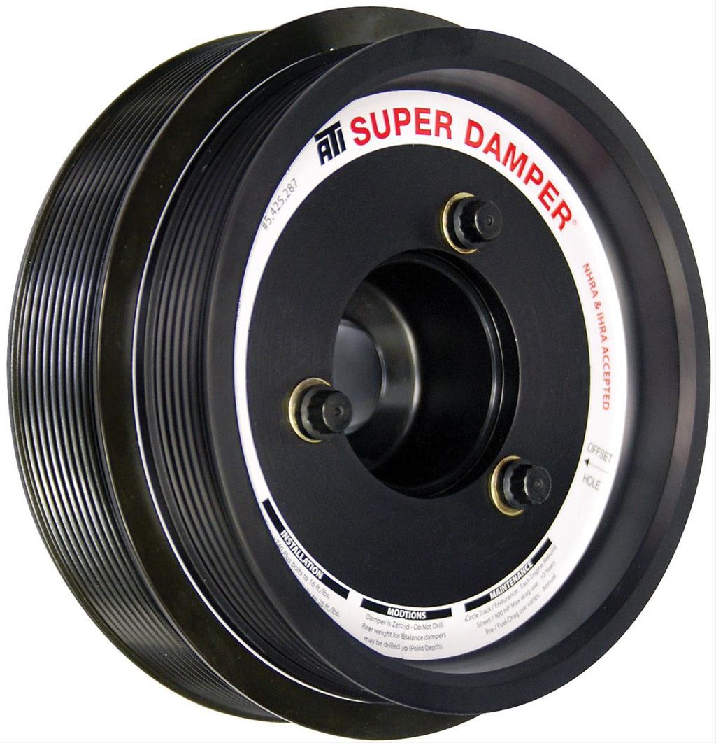 ATI Super Damper Serpentine Series harmonic balancers are patented and feature grooves for serpentine belts machined into the outer damper shell. The dampers come with six outer grooves for standard OEM drive systems—but eight and 10 grooves are available for supercharger or turbo applications. Serpentine dampers are offered in a variety of diameters, and crank hubs may be fitted with a 6-groove serpentine pulley to drive external oil pumps or vehicle accessories. The Serpentine Series Super Dampers fit all ATI GM-front crank hubs and can be adapted to many engine combinations, providing maximum flexibility. They're available in steel or lightweight, hardcoated aluminum.