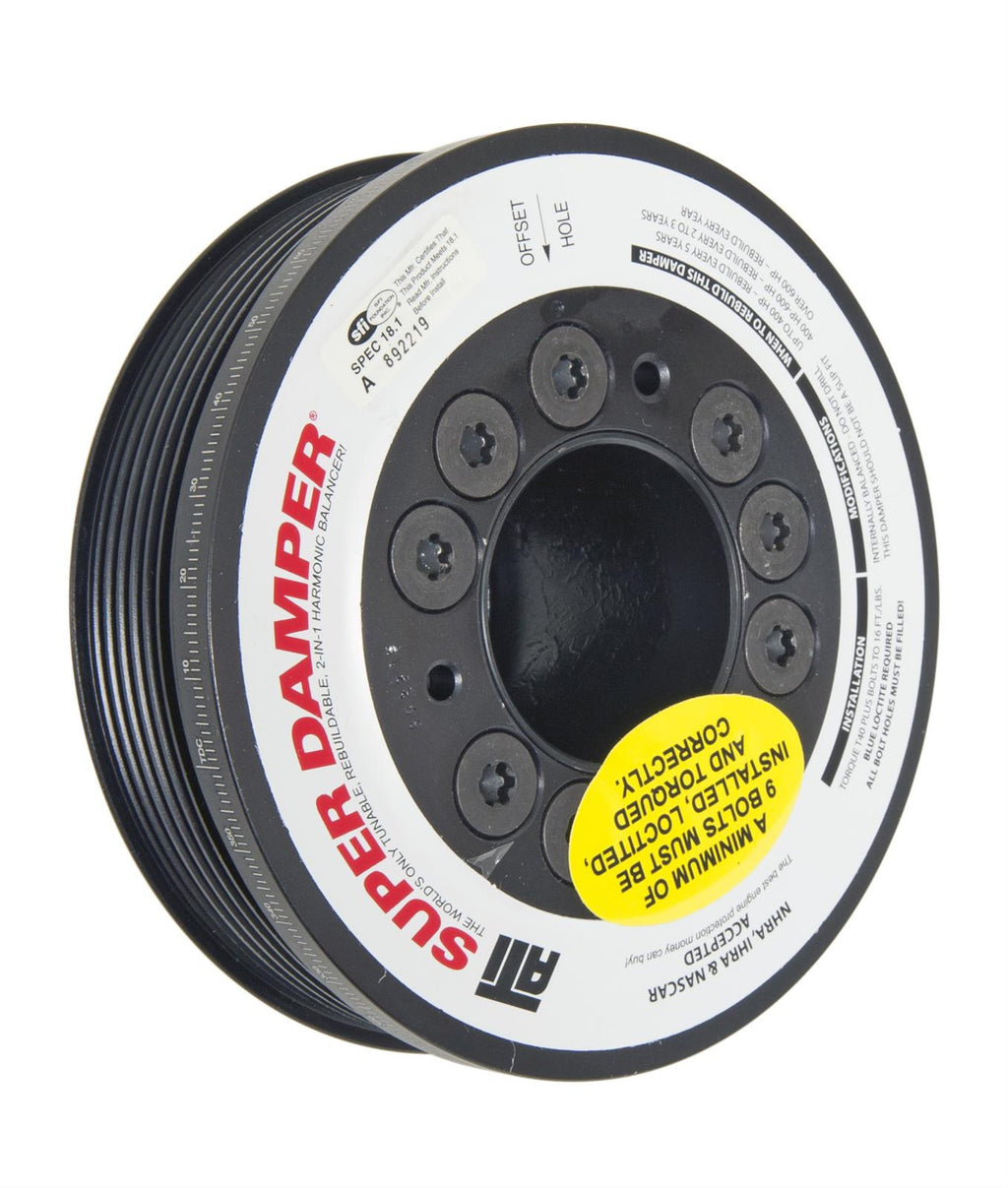 ATI Super Damper Serpentine Series harmonic balancers are patented and feature grooves for serpentine belts machined into the outer damper shell. The dampers come with six outer grooves for standard OEM drive systems—but eight and 10 grooves are available for supercharger or turbo applications. Serpentine dampers are offered in a variety of diameters, and crank hubs may be fitted with a 6-groove serpentine pulley to drive external oil pumps or vehicle accessories. The Serpentine Series Super Dampers fit all ATI GM-front crank hubs and can be adapted to many engine combinations, providing maximum flexibility. They're available in steel or lightweight, hardcoated aluminum.