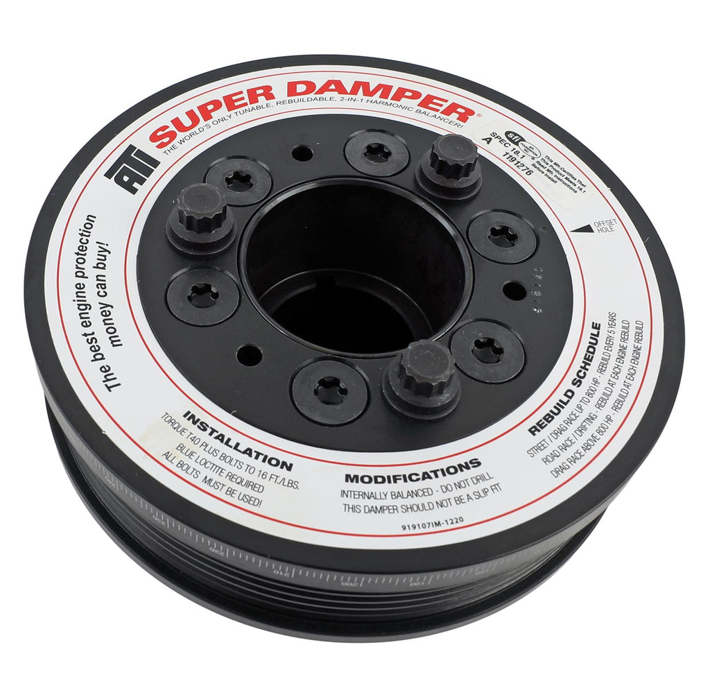 ATI Super Damper Serpentine Series harmonic balancers are patented and feature grooves for serpentine belts machined into the outer damper shell. The dampers come with six outer grooves for standard OEM drive systems—but eight and 10 grooves are available for supercharger or turbo applications. Serpentine dampers are offered in a variety of diameters, and crank hubs may be fitted with a 6-groove serpentine pulley to drive external oil pumps or vehicle accessories. The Serpentine Series Super Dampers fit all ATI GM-front crank hubs and can be adapted to many engine combinations, providing maximum flexibility. They're available in steel or lightweight, hardcoated aluminum.