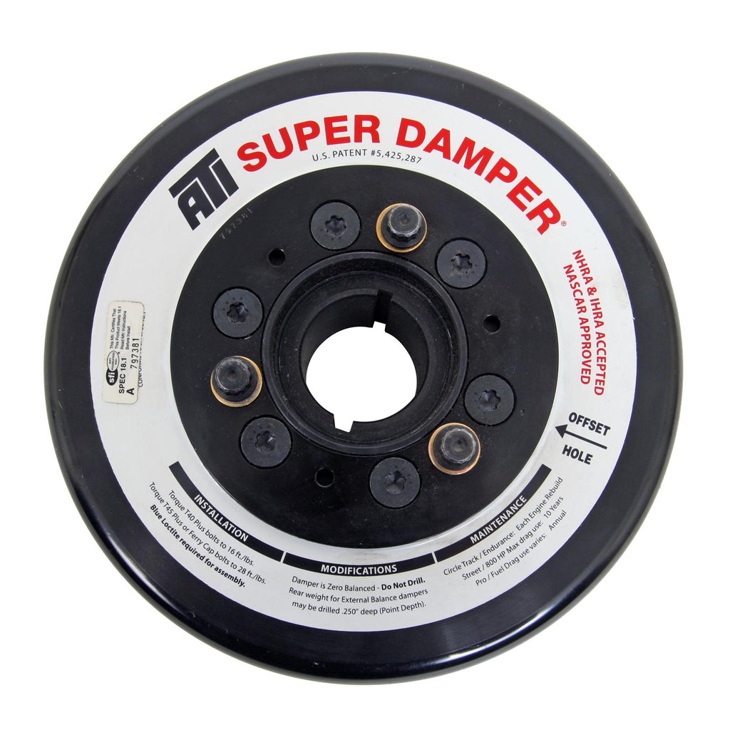 Patented ATI Super Damper standard harmonic balancers are the only crankshaft dampers designed exclusively for high performance engines. Inner and outer shells are available in aluminum or steel, and contain a steel inertia weight. The inertia weights have six (2-ring design) or eight (3-ring design) computer-machined grooves to retain the proper durometer O-rings (dyno tested for each application). Whether you race or just drive on the street, ATI harmonic balancers are the perfect choice.