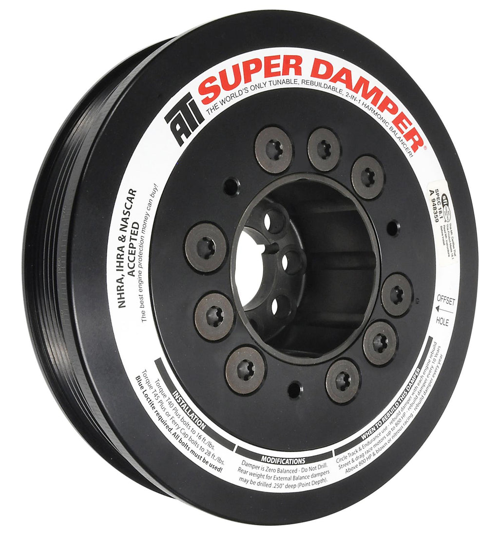 Patented ATI Super Damper standard harmonic balancers are the only crankshaft dampers designed exclusively for high performance engines. Inner and outer shells are available in aluminum or steel, and contain a steel inertia weight. The inertia weights have six (2-ring design) or eight (3-ring design) computer-machined grooves to retain the proper durometer O-rings (dyno tested for each application). Whether you race or just drive on the street, ATI harmonic balancers are the perfect choice.