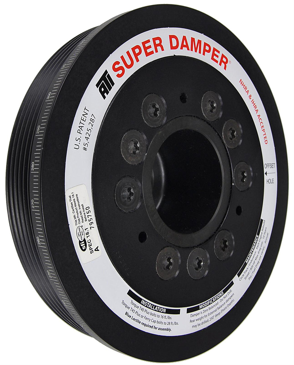 Patented ATI Super Damper standard harmonic balancers are the only crankshaft dampers designed exclusively for high performance engines. Inner and outer shells are available in aluminum or steel, and contain a steel inertia weight. The inertia weights have six (2-ring design) or eight (3-ring design) computer-machined grooves to retain the proper durometer O-rings (dyno tested for each application). Whether you race or just drive on the street, ATI harmonic balancers are the perfect choice.