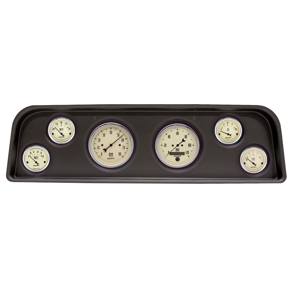 AutoMeter Antique Beige instrument clusters feature a timely, nostalgic look with the accuracy of a modern air core meter. Their beige-colored face is accented by a chrome bezel and a clear domed lens, capturing the essence of the automobiles of the past. The hollowed-out end of their antique-style pointer has a diamond shape that matches the major division increments. Each cluster also includes a polished or black billet aluminum gauge panel to complement the gauges.Brand: AutoMeter