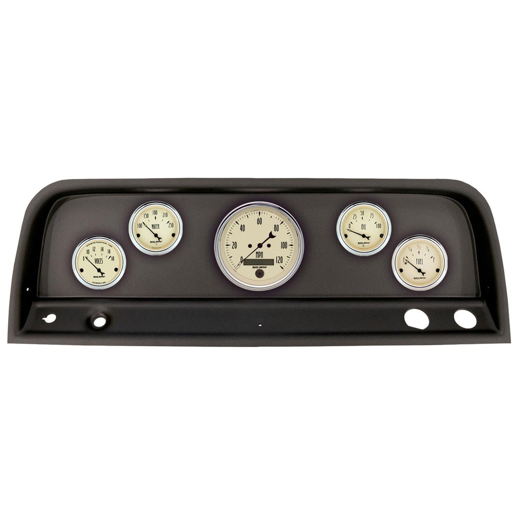 AutoMeter Antique Beige instrument clusters feature a timely, nostalgic look with the accuracy of a modern air core meter. Their beige-colored face is accented by a chrome bezel and a clear domed lens, capturing the essence of the automobiles of the past. The hollowed-out end of their antique-style pointer has a diamond shape that matches the major division increments. Each cluster also includes a polished or black billet aluminum gauge panel to complement the gauges.Brand: AutoMeter