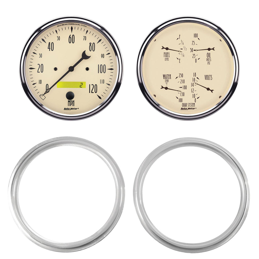 AutoMeter Antique Beige instrument clusters feature a timely, nostalgic look with the accuracy of a modern air core meter. Their beige-colored face is accented by a chrome bezel and a clear domed lens, capturing the essence of the automobiles of the past. The hollowed-out end of their antique-style pointer has a diamond shape that matches the major division increments. Each cluster also includes a polished or black billet aluminum gauge panel to complement the gauges.Brand: AutoMeter