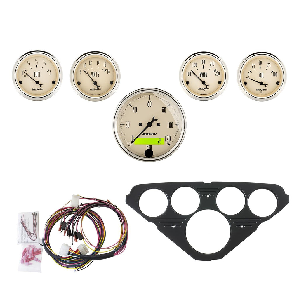 AutoMeter Antique Beige instrument clusters feature a timely, nostalgic look with the accuracy of a modern air core meter. Their beige-colored face is accented by a chrome bezel and a clear domed lens, capturing the essence of the automobiles of the past. The hollowed-out end of their antique-style pointer has a diamond shape that matches the major division increments. Each cluster also includes a polished or black billet aluminum gauge panel to complement the gauges.Brand: AutoMeter