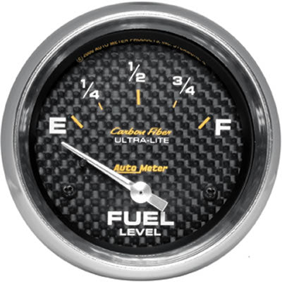 AutoMeter Carbon Fiber Ultra-Lite analog gauges combine accuracy and reliability with the cutting-edge look of carbon fiber. They feature a real carbon fiber face with a silver bezel to give your cockpit a true new-age look. The instruments are ruggedly built to withstand harsh racing environments, providing unsurpassed accuracy and reliability. These gauges are available in a dozen individual types, with options for each. Order the models needed for your dash panel.Brand: AutoMeter