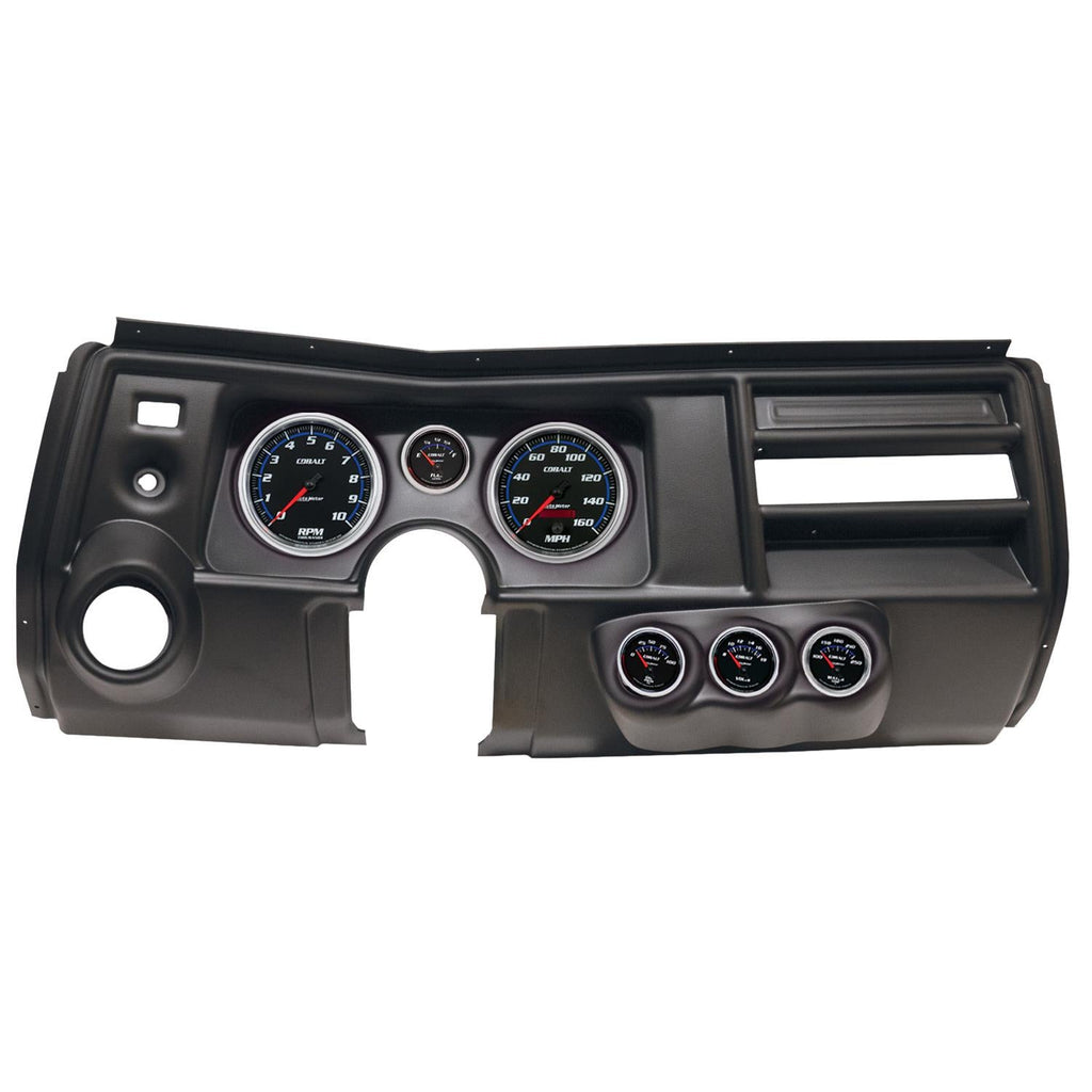 AutoMeter Cobalt instrument clusters outfit your classic muscle car or truck with direct-fit kits that offer a custom performance solution without the custom price! The Cobalt kits include a set of six iconic AutoMeter gauges that feature modern blue LED through-the-dial lighting to provide clear visibility during nighttime use, plus a rugged, durable, and paintable thermoformed ABS plastic dash panel. The instrument clusters are easy to install and require no cutting or modifications to your original dash. They also are designed with cutouts, where applicable, for factory accessory controls, air vents, and radio. Track your engine's vitals in real-time with highly responsive and accurate electric air-core gauges inside AutoMeter Cobalt instrument clusters.