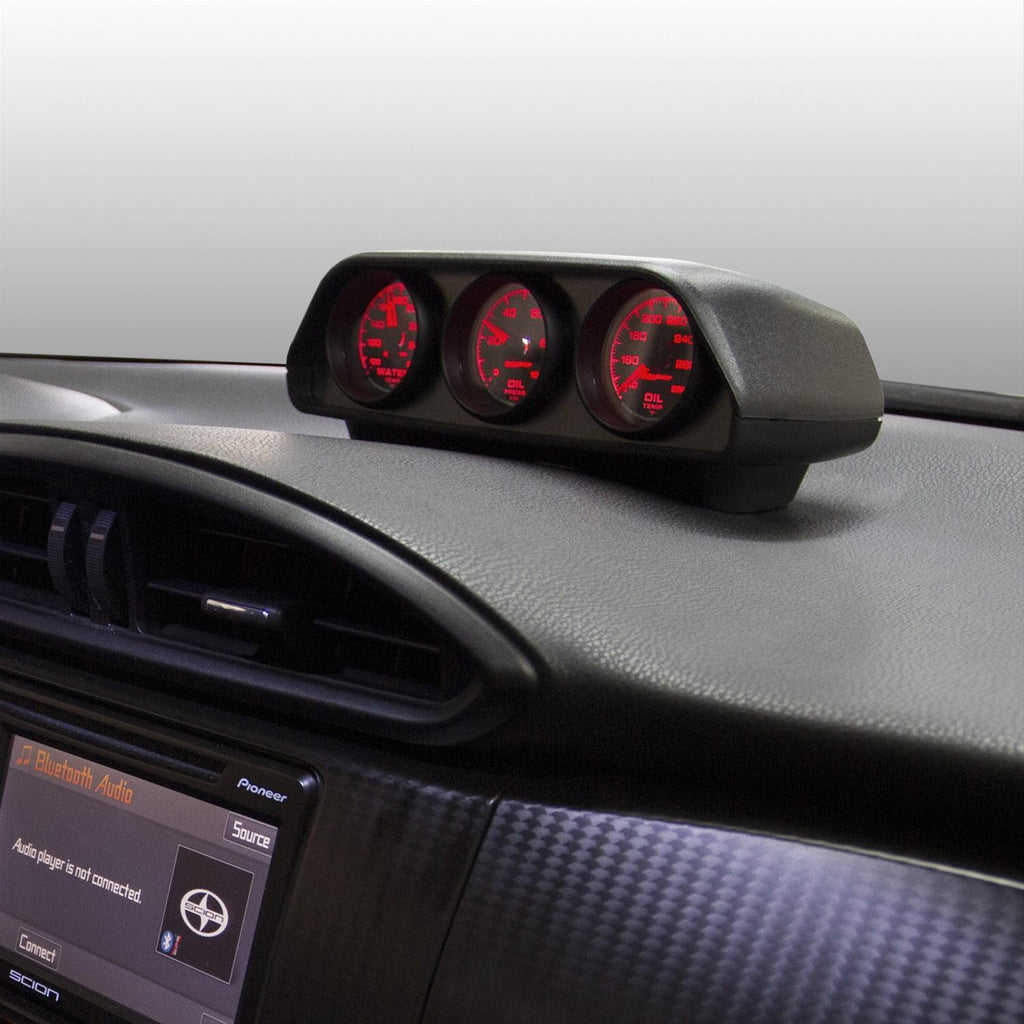 Notes: Holds three, 2 1/16 in. (52.4mm) electronic gauges; includes a reversible aluminum faceplate for a custom appearance and vehicle-specific mounting instructions. Product is 8.50 in. wide x 3.25 in. tall x 4.50 in. deep.