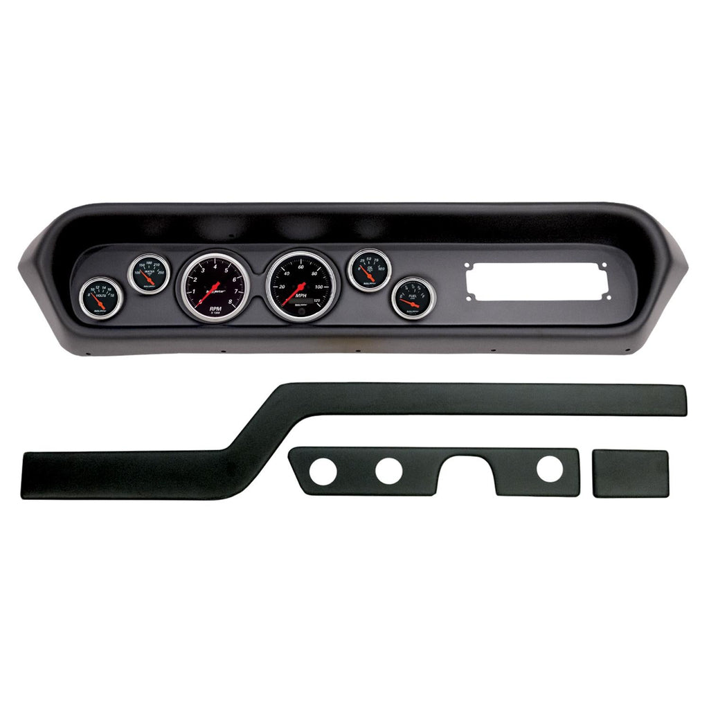 AutoMeter Designer Black instrument clusters outfit your classic muscle car or truck with the ability to track your engine's vitals in real-time with highly responsive and accurate electric air-core gauges. These direct-fit kits include a set of six iconic AutoMeter gauges that feature traditional incandescent lighting to illuminate around the perimeter of the dial, plus a rugged, durable, and paintable thermoformed ABS plastic dash panel. The instrument clusters are easy to install and require no cutting or modifications to your original dash. They also are designed with cutouts, where applicable, for factory accessory controls, air vents, and radio. Custom performance instrument solutions for your vehicle without the custom price—AutoMeter instrument clusters.