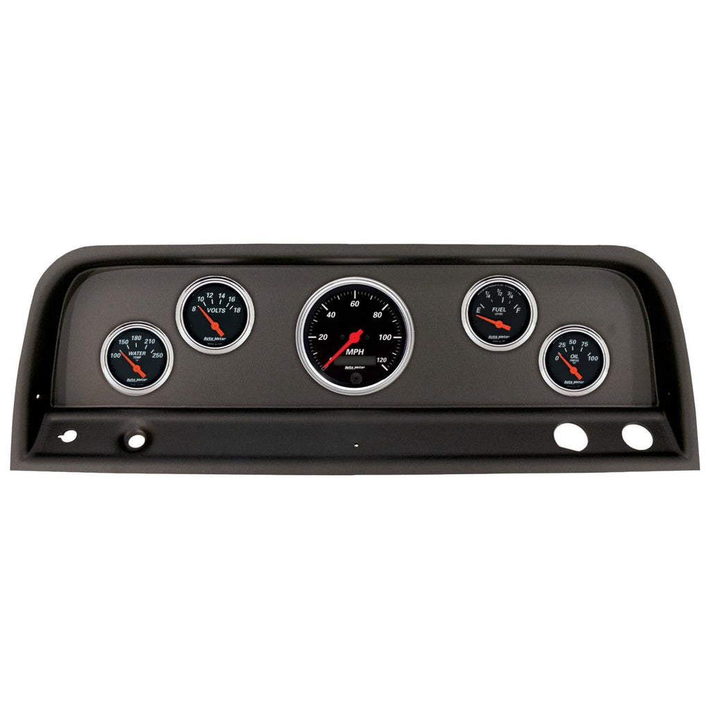AutoMeter Designer Black instrument clusters outfit your classic muscle car or truck with the ability to track your engine's vitals in real-time with highly responsive and accurate electric air-core gauges. These direct-fit kits include a set of six iconic AutoMeter gauges that feature traditional incandescent lighting to illuminate around the perimeter of the dial, plus a rugged, durable, and paintable thermoformed ABS plastic dash panel. The instrument clusters are easy to install and require no cutting or modifications to your original dash. They also are designed with cutouts, where applicable, for factory accessory controls, air vents, and radio. Custom performance instrument solutions for your vehicle without the custom price—AutoMeter instrument clusters.