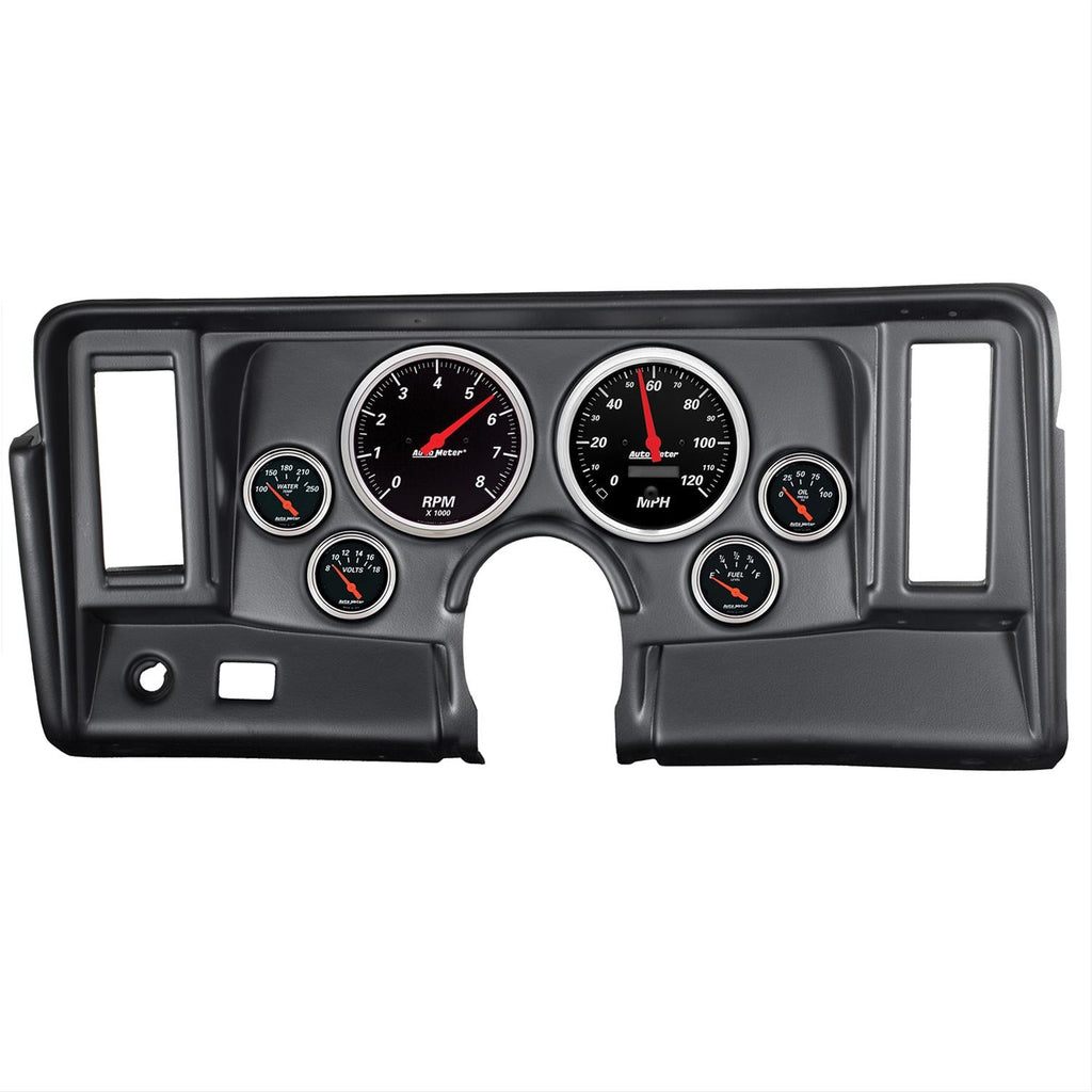 AutoMeter Designer Black instrument clusters outfit your classic muscle car or truck with the ability to track your engine's vitals in real-time with highly responsive and accurate electric air-core gauges. These direct-fit kits include a set of six iconic AutoMeter gauges that feature traditional incandescent lighting to illuminate around the perimeter of the dial, plus a rugged, durable, and paintable thermoformed ABS plastic dash panel. The instrument clusters are easy to install and require no cutting or modifications to your original dash. They also are designed with cutouts, where applicable, for factory accessory controls, air vents, and radio. Custom performance instrument solutions for your vehicle without the custom price—AutoMeter instrument clusters.