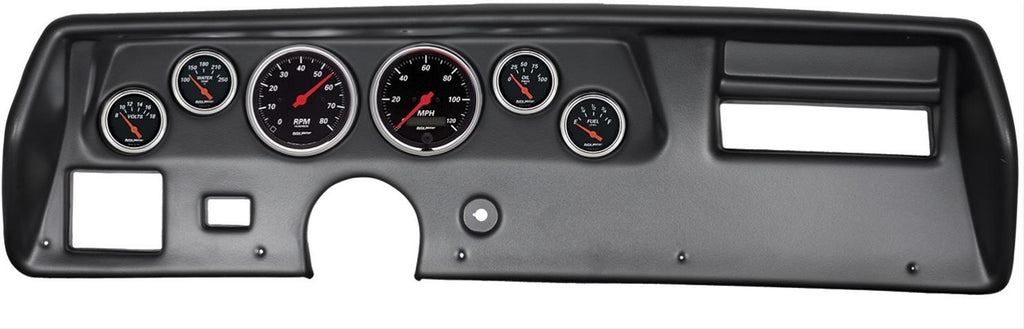 AutoMeter Designer Black instrument clusters outfit your classic muscle car or truck with the ability to track your engine's vitals in real-time with highly responsive and accurate electric air-core gauges. These direct-fit kits include a set of six iconic AutoMeter gauges that feature traditional incandescent lighting to illuminate around the perimeter of the dial, plus a rugged, durable, and paintable thermoformed ABS plastic dash panel. The instrument clusters are easy to install and require no cutting or modifications to your original dash. They also are designed with cutouts, where applicable, for factory accessory controls, air vents, and radio. Custom performance instrument solutions for your vehicle without the custom price—AutoMeter instrument clusters.