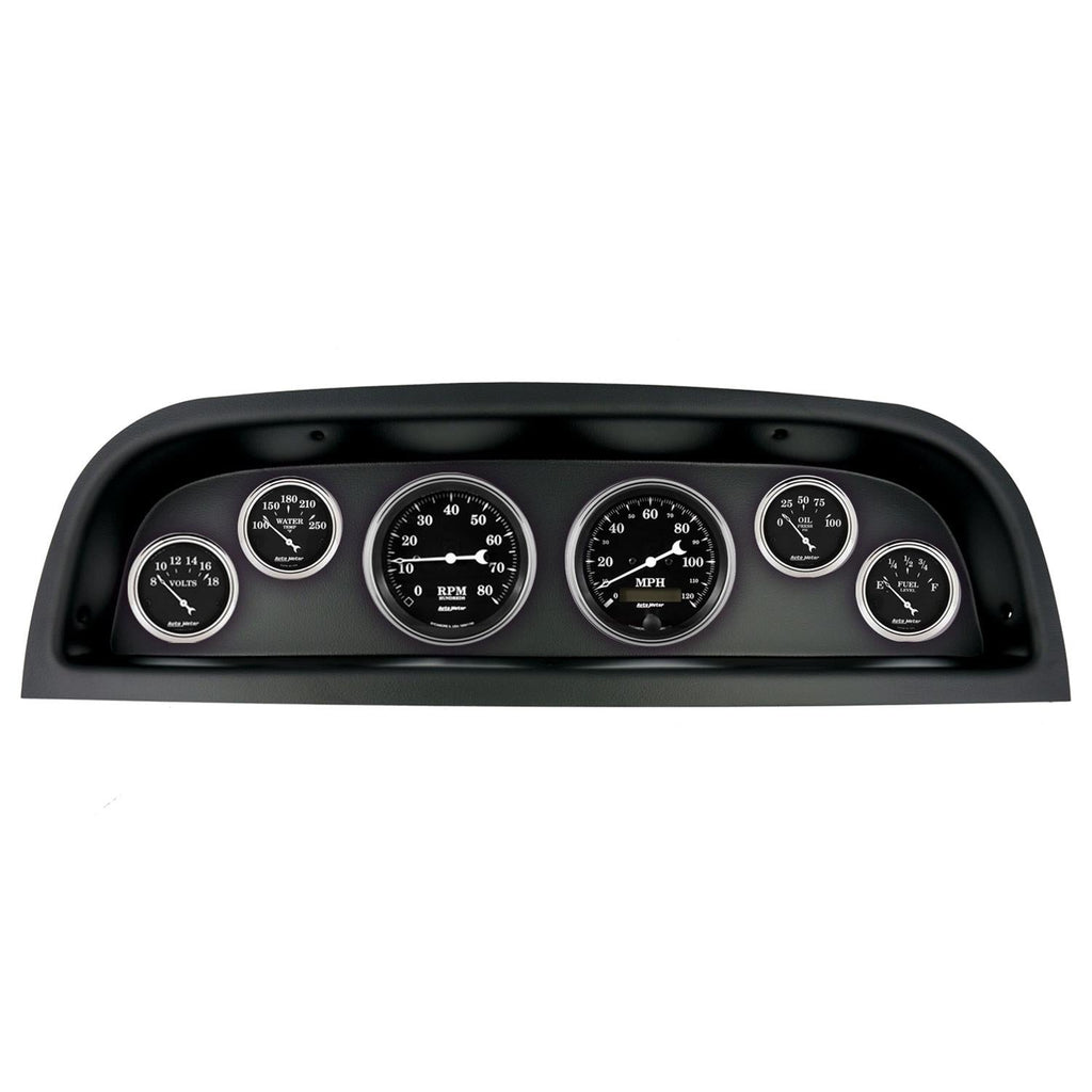 AutoMeter Old Tyme Black Series instrument clusters provide a custom performance instrumentation solution without the custom fab price. These easy-to-install direct-fit gauge/dash kits include a set of iconic Old Tyme Black Series gauges featuring matte black dials, vintage artwork, arrow pointers, domed lenses and bright chrome bezels. The kits will also include precision engineered direct-fit dash panel/gauge adapter plate, wiring harness, senders, and all the essentials needed to complete the installation. AutoMeter instrument clusters are complete package solutions that simplify the process of gauge installation while providing a clean, timeless look. They are available in many different 2-, 5-, and 6-piece configurations to outfit a variety of classic cars and trucks with modern performance.
