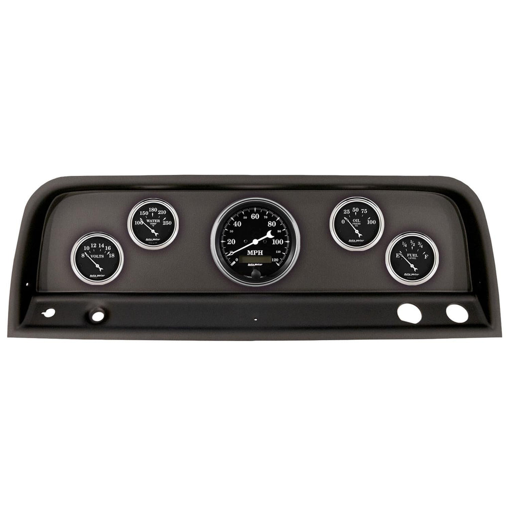AutoMeter Old Tyme Black Series instrument clusters provide a custom performance instrumentation solution without the custom fab price. These easy-to-install direct-fit gauge/dash kits include a set of iconic Old Tyme Black Series gauges featuring matte black dials, vintage artwork, arrow pointers, domed lenses and bright chrome bezels. The kits will also include precision engineered direct-fit dash panel/gauge adapter plate, wiring harness, senders, and all the essentials needed to complete the installation. AutoMeter instrument clusters are complete package solutions that simplify the process of gauge installation while providing a clean, timeless look. They are available in many different 2-, 5-, and 6-piece configurations to outfit a variety of classic cars and trucks with modern performance.