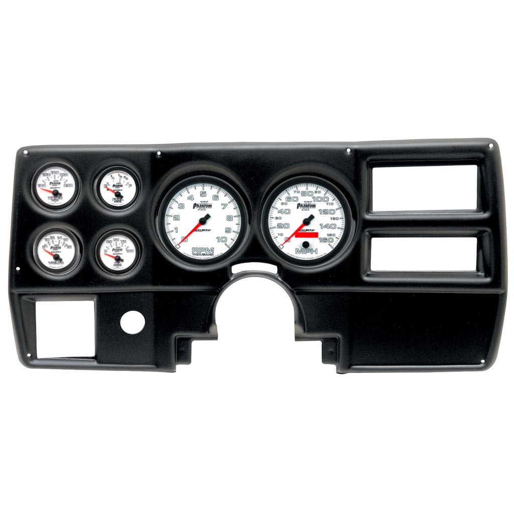 AutoMeter Phantom II instrument clusters are available in a variety of 5- and 6-gauge layouts. These replacement gauges are available mounted in direct-fit replacement dash panels. The easy-to-install packages include stunning Phantom II gauges (of different diameters), featuring large outlined silver numerals on a white background for an inconspicuous look. Black bezels and panels provide a stylish, modern contrast. The cluster layouts are application-specific; order the model recommended for your vehicle.Brand: AutoMeter