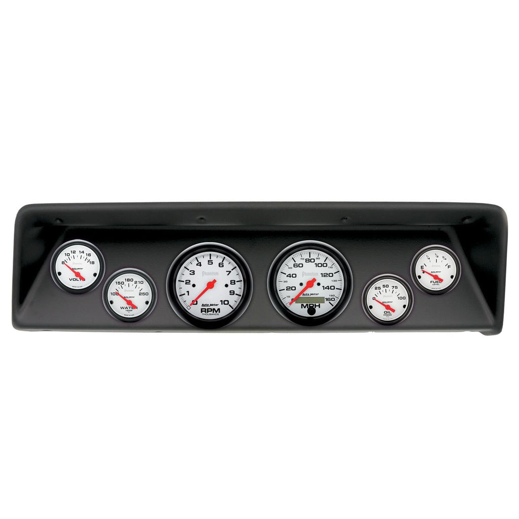 AutoMeter Phantom instrument clusters are available in a variety of 6-gauge layouts. These replacement dials are available mounted in direct-fit replacement dash panels. The easy-to-install packages include stunning Phantom gauges (of different diameters), featuring bold black numerals on a white background for a clean and easily readable look. Black bezels and panels provide a stylish, modern contrast. AutoMeter cluster layouts are application-specific for classic muscle cars, trucks, and more. Order the model recommended for your vehicle.Brand: AutoMeter