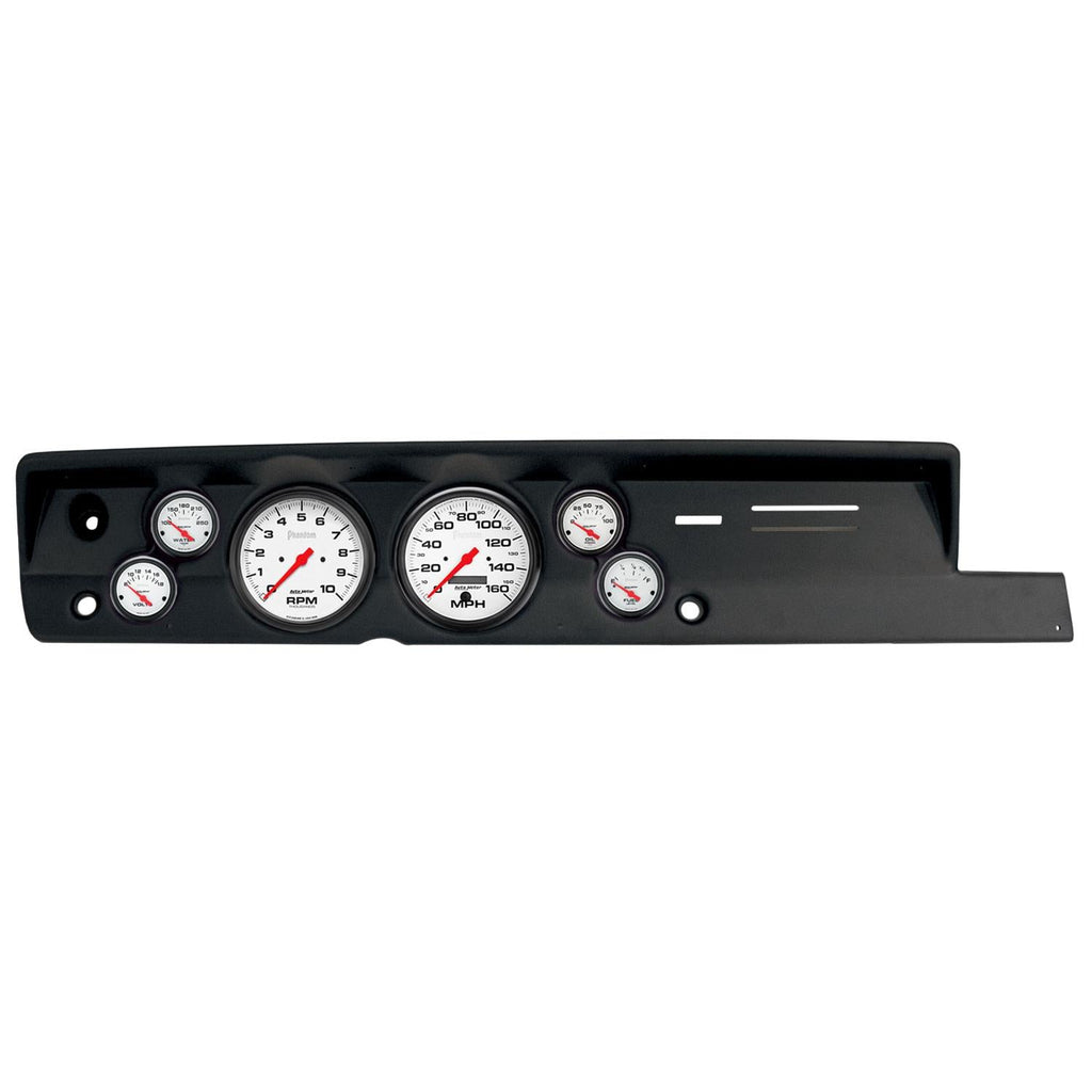 AutoMeter Phantom instrument clusters are available in a variety of 6-gauge layouts. These replacement dials are available mounted in direct-fit replacement dash panels. The easy-to-install packages include stunning Phantom gauges (of different diameters), featuring bold black numerals on a white background for a clean and easily readable look. Black bezels and panels provide a stylish, modern contrast. AutoMeter cluster layouts are application-specific for classic muscle cars, trucks, and more. Order the model recommended for your vehicle.Brand: AutoMeter