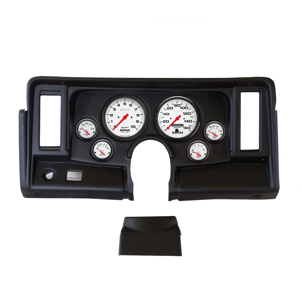 AutoMeter Phantom instrument clusters are available in a variety of 6-gauge layouts. These replacement dials are available mounted in direct-fit replacement dash panels. The easy-to-install packages include stunning Phantom gauges (of different diameters), featuring bold black numerals on a white background for a clean and easily readable look. Black bezels and panels provide a stylish, modern contrast. AutoMeter cluster layouts are application-specific for classic muscle cars, trucks, and more. Order the model recommended for your vehicle.Brand: AutoMeter