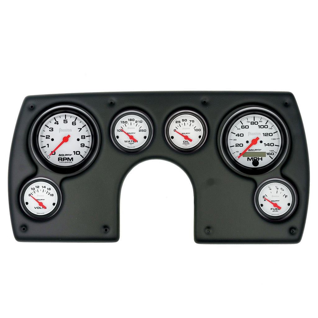 AutoMeter Phantom instrument clusters are available in a variety of 6-gauge layouts. These replacement dials are available mounted in direct-fit replacement dash panels. The easy-to-install packages include stunning Phantom gauges (of different diameters), featuring bold black numerals on a white background for a clean and easily readable look. Black bezels and panels provide a stylish, modern contrast. AutoMeter cluster layouts are application-specific for classic muscle cars, trucks, and more. Order the model recommended for your vehicle.Brand: AutoMeter