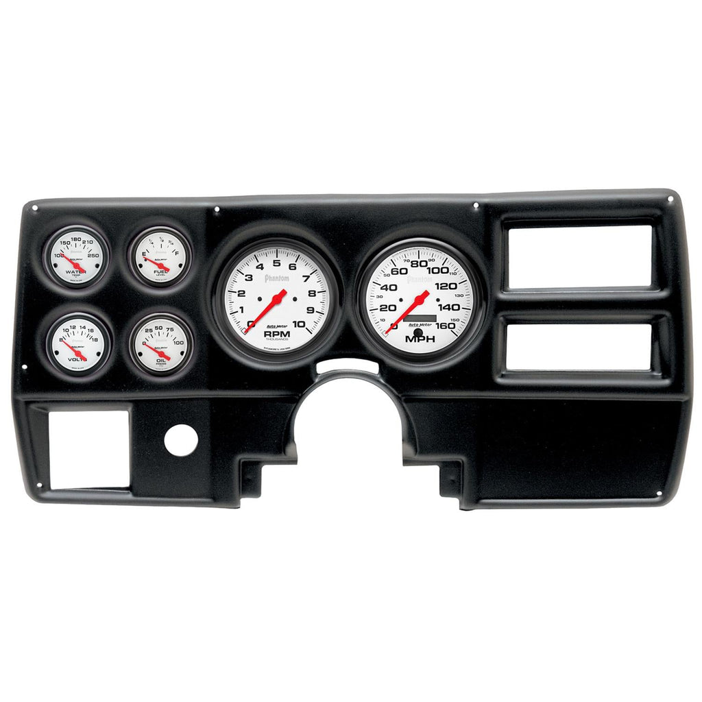 AutoMeter Phantom instrument clusters are available in a variety of 6-gauge layouts. These replacement dials are available mounted in direct-fit replacement dash panels. The easy-to-install packages include stunning Phantom gauges (of different diameters), featuring bold black numerals on a white background for a clean and easily readable look. Black bezels and panels provide a stylish, modern contrast. AutoMeter cluster layouts are application-specific for classic muscle cars, trucks, and more. Order the model recommended for your vehicle.Brand: AutoMeter