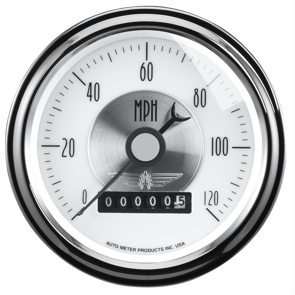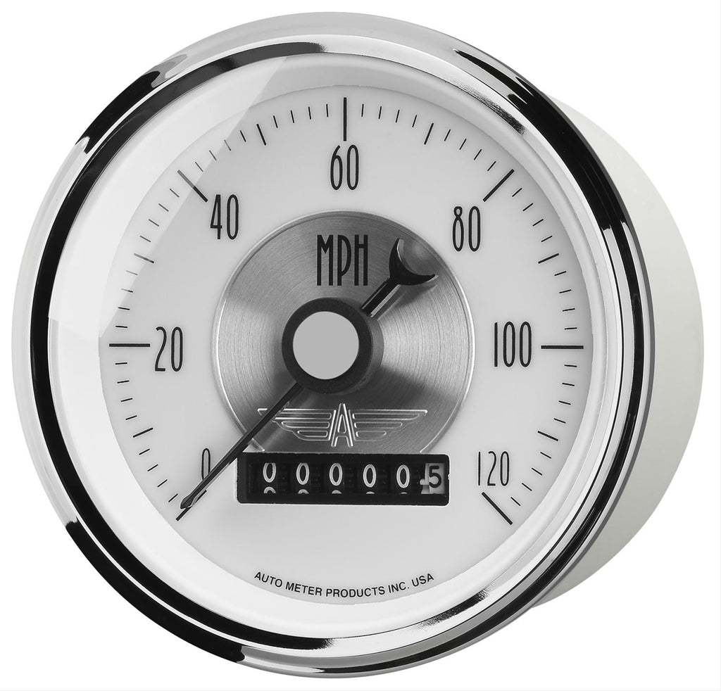 Get the best in looks and precision with AutoMeter Prestige speedometers. A speedometer is a must, and the Prestige line offers accuracy with classic styling. Arrow-styled needles and period-correct fonts create a vintage look, while state-of-the-art technology provides the exact data that you need. Plus, for the first time, you can choose an odometer that's either mechanical wheel-style or LCD. Prestige gauges are offered in Antique Ivory, Black Diamond, or white faces with contrasting numerals—each with soft illumination for nighttime visibility.Brand: AutoMeter