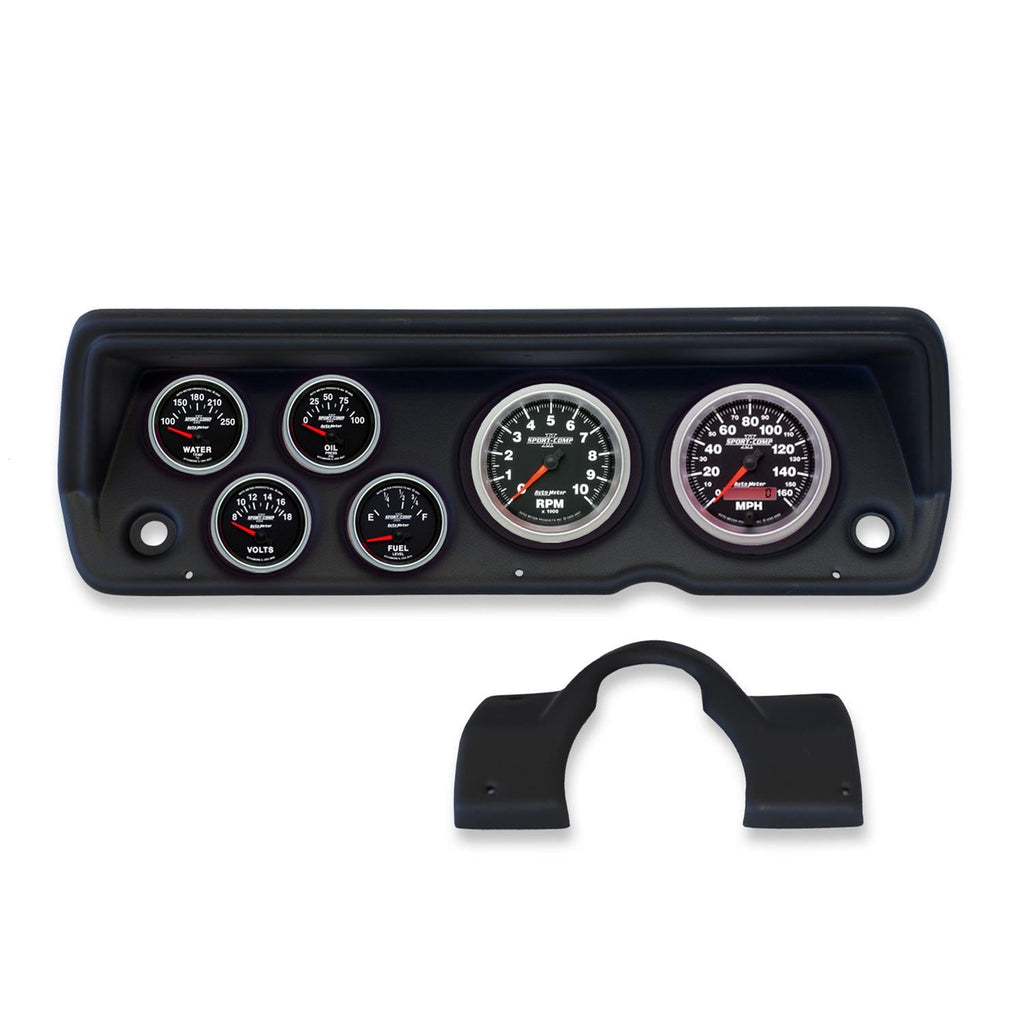 AutoMeter Sport-Comp II instrument clusters are available in a variety of 5- and 6-gauge layouts. These replacement dials are available mounted in direct-fit replacement dash panels. The easy-to-install packages include stunning Sport-Comp II gauges (of different diameters), featuring bold white numerals on a black background for a clean and easily readable look. Silver bezels and black panels provide a stylish, modern contrast. AutoMeter cluster layouts are application-specific for classic muscle cars, trucks, and more. Order the model recommended for your vehicle.