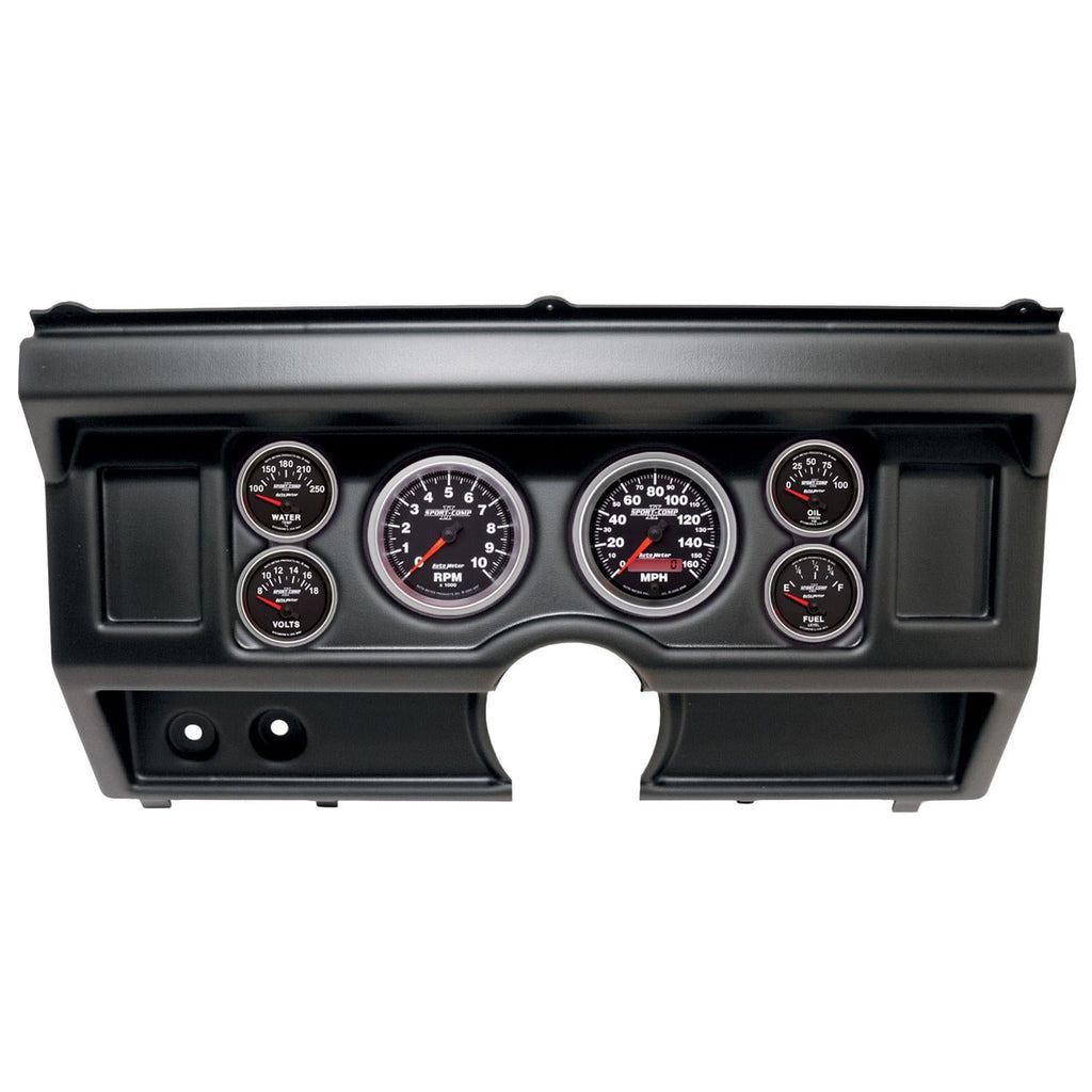 AutoMeter Sport-Comp II instrument clusters are available in a variety of 5- and 6-gauge layouts. These replacement dials are available mounted in direct-fit replacement dash panels. The easy-to-install packages include stunning Sport-Comp II gauges (of different diameters), featuring bold white numerals on a black background for a clean and easily readable look. Silver bezels and black panels provide a stylish, modern contrast. AutoMeter cluster layouts are application-specific for classic muscle cars, trucks, and more. Order the model recommended for your vehicle.