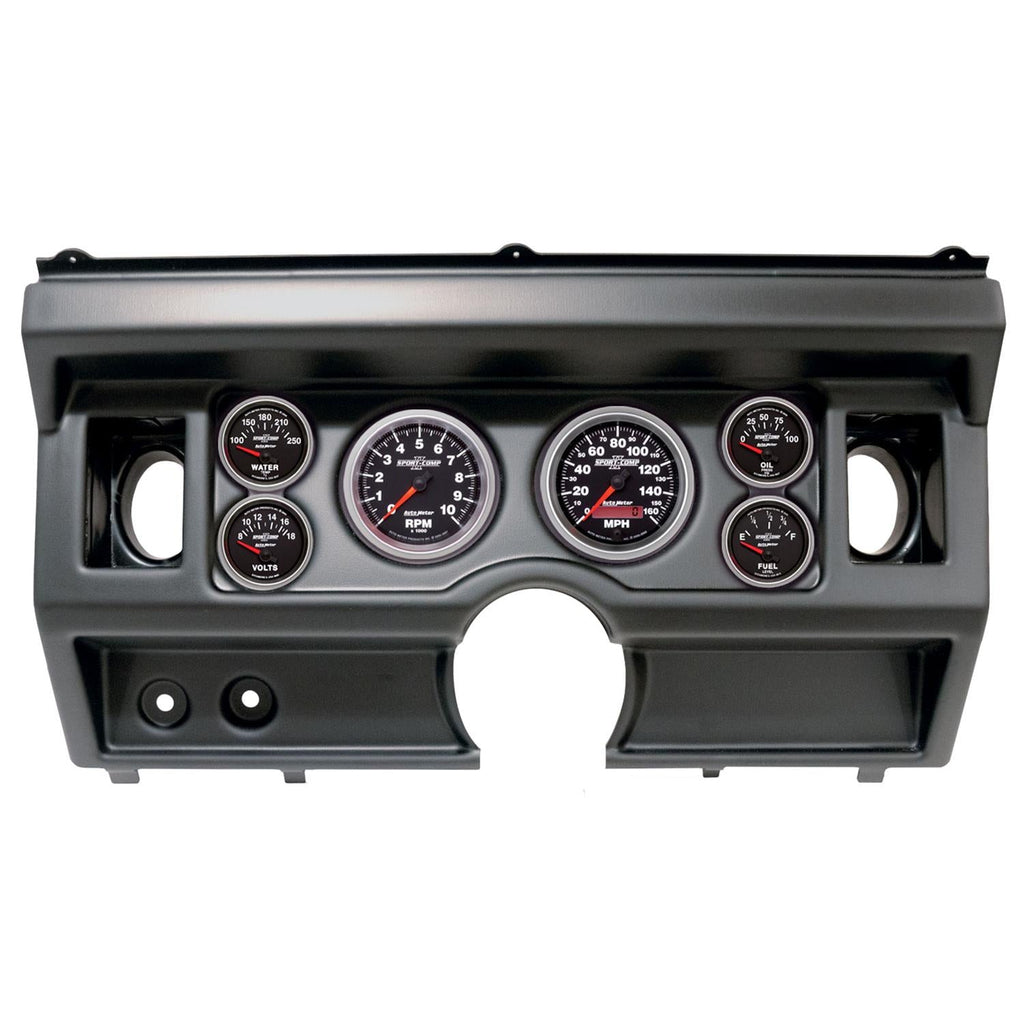 AutoMeter Sport-Comp II instrument clusters are available in a variety of 5- and 6-gauge layouts. These replacement dials are available mounted in direct-fit replacement dash panels. The easy-to-install packages include stunning Sport-Comp II gauges (of different diameters), featuring bold white numerals on a black background for a clean and easily readable look. Silver bezels and black panels provide a stylish, modern contrast. AutoMeter cluster layouts are application-specific for classic muscle cars, trucks, and more. Order the model recommended for your vehicle.