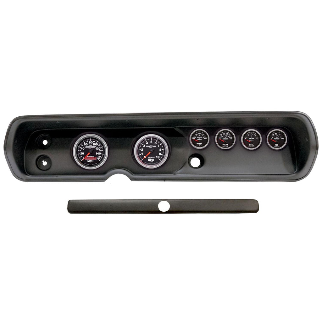 AutoMeter Sport-Comp II instrument clusters are available in a variety of 5- and 6-gauge layouts. These replacement dials are available mounted in direct-fit replacement dash panels. The easy-to-install packages include stunning Sport-Comp II gauges (of different diameters), featuring bold white numerals on a black background for a clean and easily readable look. Silver bezels and black panels provide a stylish, modern contrast. AutoMeter cluster layouts are application-specific for classic muscle cars, trucks, and more. Order the model recommended for your vehicle.