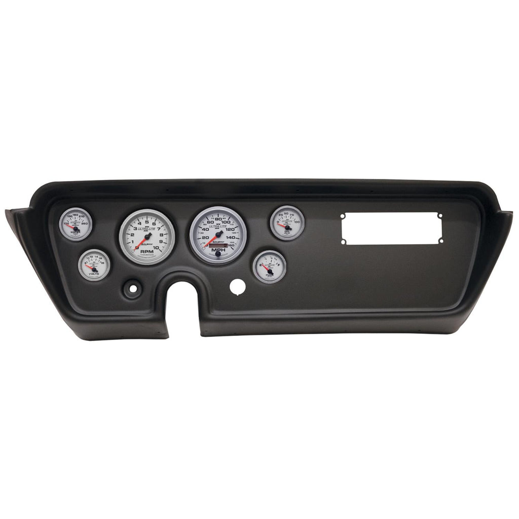 AutoMeter Ultra-Lite II instrument clusters are available in a variety of 5- and 6-gauge layouts. These replacement dials are available mounted in direct-fit replacement dash panels. The easy-to-install packages include stunning Ultra-Lite II gauges (of different diameters), featuring bold black numerals on a silver background for a clean, modern look. Silver bezels and black panels provide a stylish contrast. AutoMeter cluster layouts are application-specific for classic muscle cars, trucks, and more. Order the model recommended for your vehicle.Brand: AutoMeter