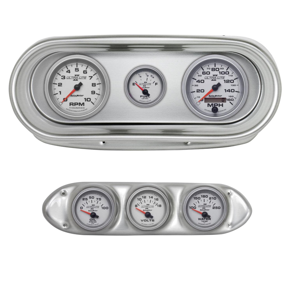 AutoMeter Ultra-Lite II instrument clusters are available in a variety of 5- and 6-gauge layouts. These replacement dials are available mounted in direct-fit replacement dash panels. The easy-to-install packages include stunning Ultra-Lite II gauges (of different diameters), featuring bold black numerals on a silver background for a clean, modern look. Silver bezels and black panels provide a stylish contrast. AutoMeter cluster layouts are application-specific for classic muscle cars, trucks, and more. Order the model recommended for your vehicle.Brand: AutoMeter