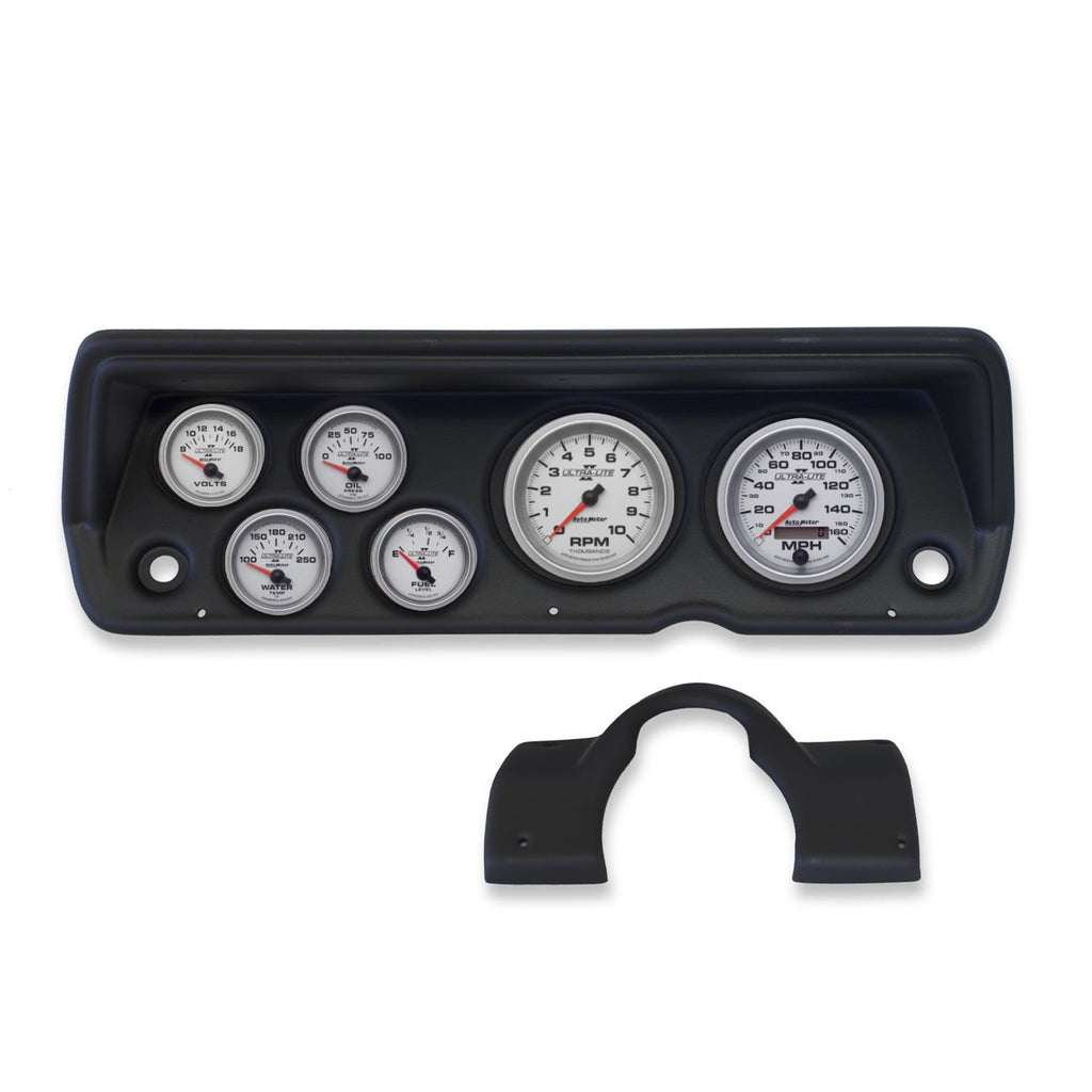 AutoMeter Ultra-Lite II instrument clusters are available in a variety of 5- and 6-gauge layouts. These replacement dials are available mounted in direct-fit replacement dash panels. The easy-to-install packages include stunning Ultra-Lite II gauges (of different diameters), featuring bold black numerals on a silver background for a clean, modern look. Silver bezels and black panels provide a stylish contrast. AutoMeter cluster layouts are application-specific for classic muscle cars, trucks, and more. Order the model recommended for your vehicle.Brand: AutoMeter