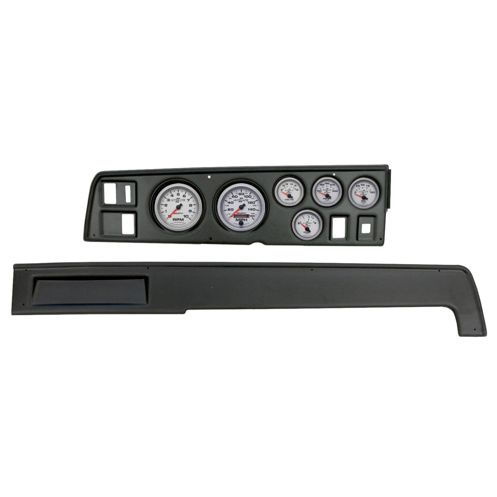 AutoMeter Ultra-Lite II instrument clusters are available in a variety of 5- and 6-gauge layouts. These replacement dials are available mounted in direct-fit replacement dash panels. The easy-to-install packages include stunning Ultra-Lite II gauges (of different diameters), featuring bold black numerals on a silver background for a clean, modern look. Silver bezels and black panels provide a stylish contrast. AutoMeter cluster layouts are application-specific for classic muscle cars, trucks, and more. Order the model recommended for your vehicle.Brand: AutoMeter