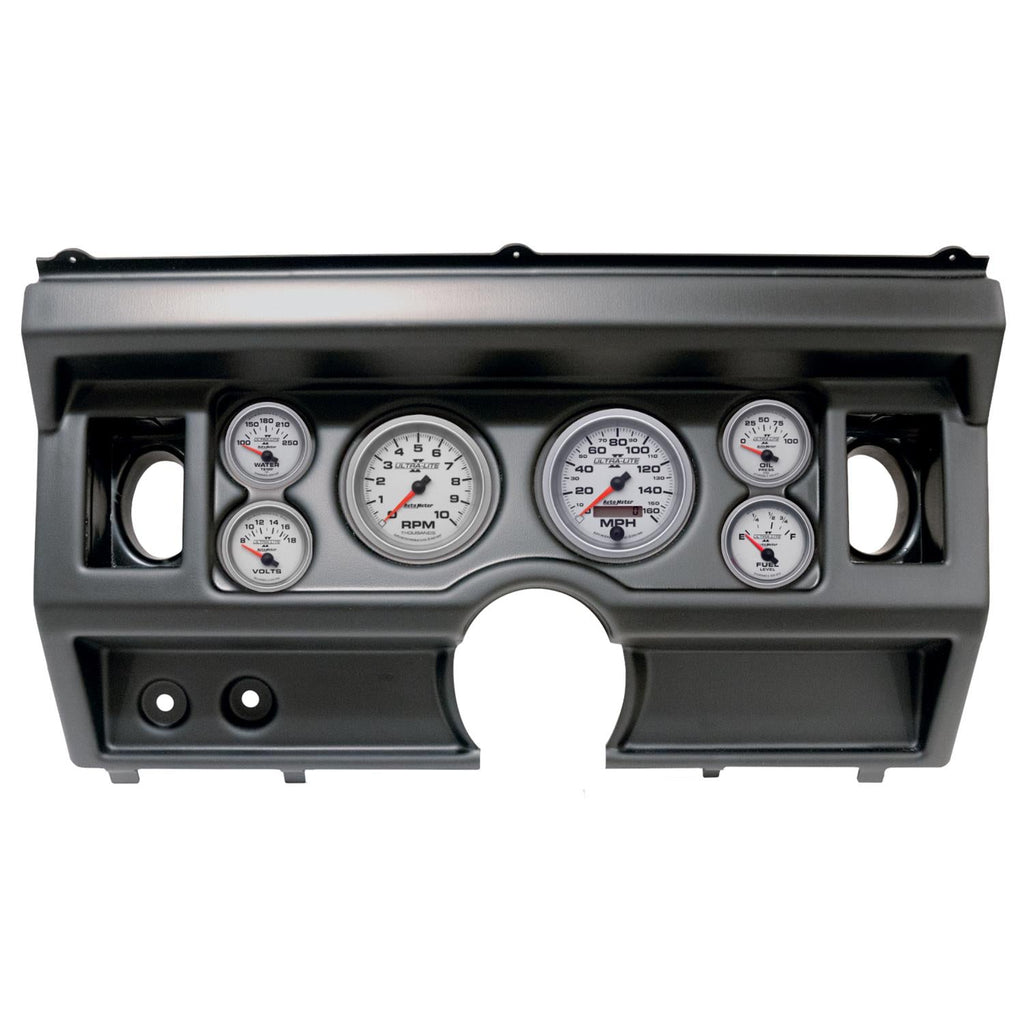 AutoMeter Ultra-Lite II instrument clusters are available in a variety of 5- and 6-gauge layouts. These replacement dials are available mounted in direct-fit replacement dash panels. The easy-to-install packages include stunning Ultra-Lite II gauges (of different diameters), featuring bold black numerals on a silver background for a clean, modern look. Silver bezels and black panels provide a stylish contrast. AutoMeter cluster layouts are application-specific for classic muscle cars, trucks, and more. Order the model recommended for your vehicle.Brand: AutoMeter