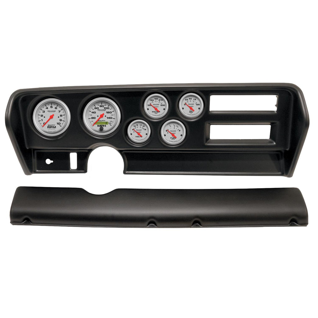 AutoMeter Ultra-Lite instrument clusters offer your classic muscle car or truck race-proven air-core electric gauges that provide quick and accurate readings. Six iconic dials are set inside a direct-fit rugged, durable, and paintable thermoformed ABS plastic dash panel. The Ultra-Lite gauges feature traditional incandescent lighting to illuminate around the perimeter of the dials, while the dash delivers an easy install without modifications to your original dash. They are designed with cutouts, where applicable, for factory accessory controls, air vents, and radio. Get custom performance instrument solutions for your vehicle without the custom price.