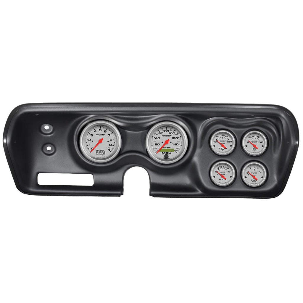 AutoMeter Ultra-Lite instrument clusters offer your classic muscle car or truck race-proven air-core electric gauges that provide quick and accurate readings. Six iconic dials are set inside a direct-fit rugged, durable, and paintable thermoformed ABS plastic dash panel. The Ultra-Lite gauges feature traditional incandescent lighting to illuminate around the perimeter of the dials, while the dash delivers an easy install without modifications to your original dash. They are designed with cutouts, where applicable, for factory accessory controls, air vents, and radio. Get custom performance instrument solutions for your vehicle without the custom price.