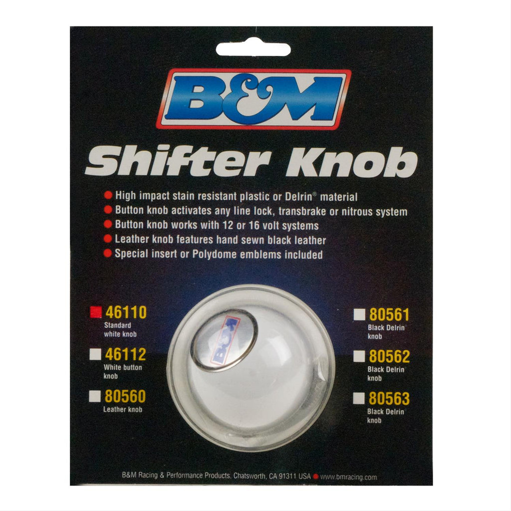 B&M white high impact shifter knobs include a clear lens and B&M logo. The white stain resistant knob fits most B&M shifters. 1/2-20, 3/8-24, 3/8-16 and 5/16-18 threaded insert are also included.Brand: B&M