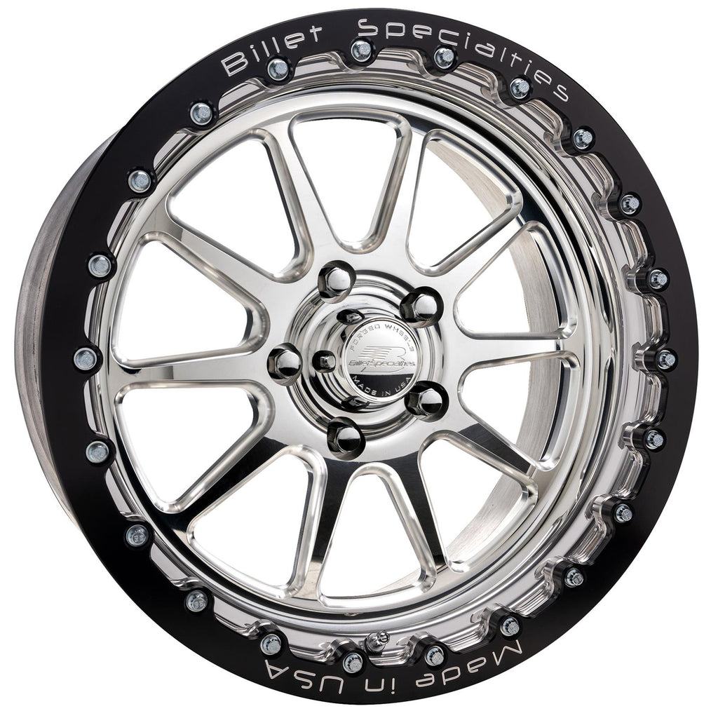 Billet Specialties AMC40 Malibu single beadlock polished custom order wheels are part of the American Muscle Collection. Each wheel is precision-machined from forged 6061-T6 aluminum centers and then mated to a spun 6061 one-piece conventional lip barrel. They feature 10 tapered spokes, a center hub designed for exposed lugs, and a contrasting black anodized scalloped functional beadlock ring. These beautiful 17 in. wheels are offered in a variety of widths, bolt patterns, and other fitment choices. (Additional finishes and/or beadlock options are also available.) ** Single beadlock works with tire bead bundles that are .625 in. or thicker.
