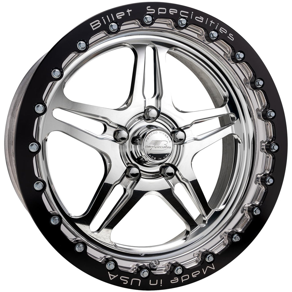 Billet Specialties AMC45 Lonestar single beadlock polished custom order wheels are part of the American Muscle Collection. Each wheel is precision-machined from forged 6061-T6 aluminum centers and then mated to a spun 6061 one-piece conventional lip barrel. They feature five split-spokes with contoured inner windows, a center hub designed for exposed lugs, and a contrasting black anodized functional beadlock ring. These beautiful 17 in. truck wheels are offered in a variety of widths, bolt patterns, and other fitment choices. (Additional finishes and/or beadlock options are also available.) ** Single beadlock works with tire bead bundles that are .625 in. or thicker.