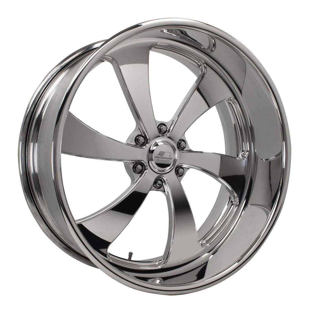 Billet Specialties BLVD Series 71 polished custom order big wheels make a bold statement of style that will separate your ride from the pack. They look great on a slammed pickup or an American classic with urban styling. Each 2-piece wheel is precision-machined from forged 6061-T6 aluminum centers for light weight, and then mated to a spun 6061 one-piece conventional lip barrel for strength and trueness. BLVD 71 rims feature six flared, curved, and arching spokes with beveled edges, plus a center hub designed for exposed lugs. These sporty wheels are available in a variety of size options—including extreme custom widths through 16 in.—and bolt patterns for the front and/or rear or your vehicle. A blend of retro style, strength, and performance!