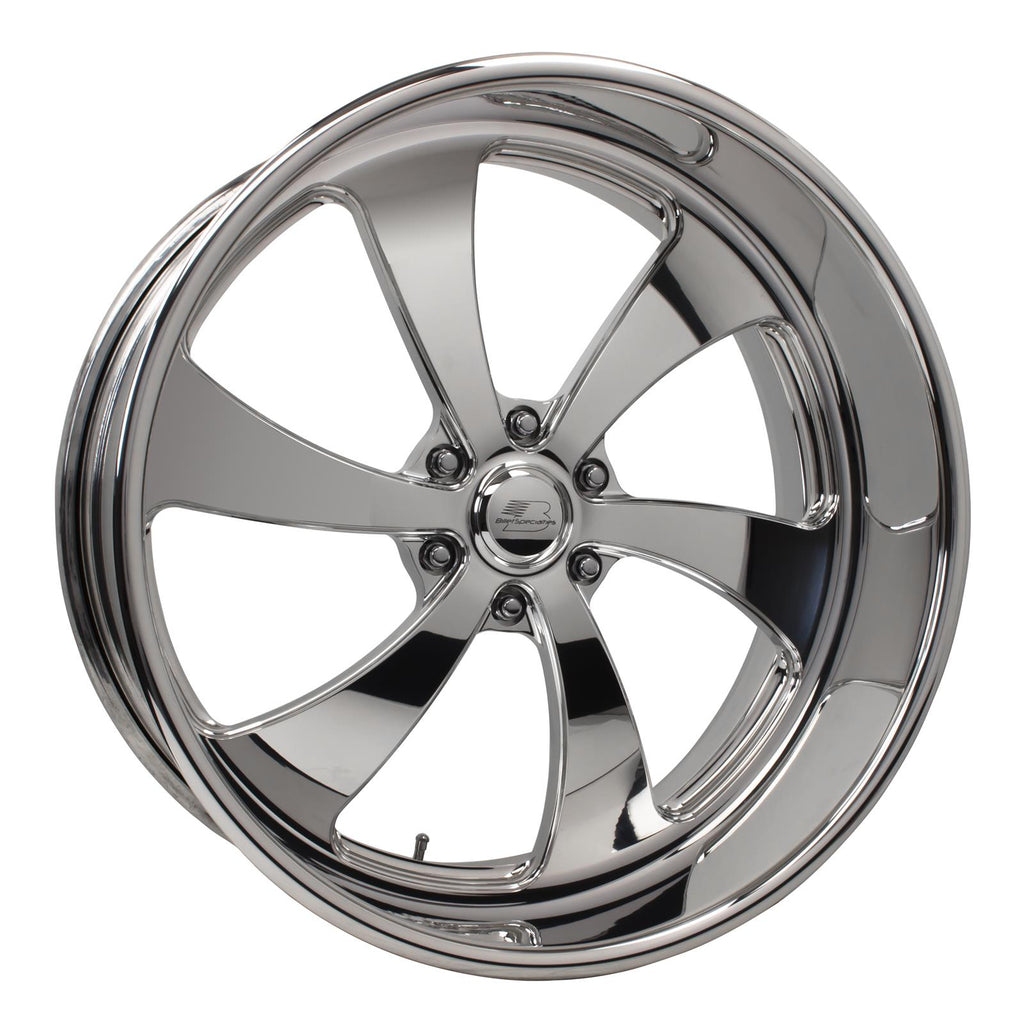 Billet Specialties BLVD Series 71 polished custom order big wheels make a bold statement of style that will separate your ride from the pack. They look great on a slammed pickup or an American classic with urban styling. Each 2-piece wheel is precision-machined from forged 6061-T6 aluminum centers for light weight, and then mated to a spun 6061 one-piece conventional lip barrel for strength and trueness. BLVD 71 rims feature six flared, curved, and arching spokes with beveled edges, plus a center hub designed for exposed lugs. These sporty wheels are available in a variety of size options—including extreme custom widths through 16 in.—and bolt patterns for the front and/or rear or your vehicle. A blend of retro style, strength, and performance!