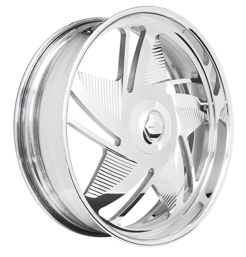 Billet Specialties GS Series GS29 Manta Star polished custom order big wheels make a bold statement of style that will separate your ride from the pack. These superstars from the past have returned with new perks. Each 2-piece wheel is precision-machined from forged 6061-T6 aluminum centers for light weight, and then mated to a spun 6061 one-piece conventional lip barrel for strength and trueness. Manta Star rims feature five wide spokes with a vertical slide and horizontal grooves; plus a center hub designed for hidden lugs. These flashy wheels are available in a variety of size options—including extreme custom widths through 16 in.—for the front and/or rear or your vehicle. Additional powdercoat finish choices are also offered. An exquisite blend of style, strength, and performance!