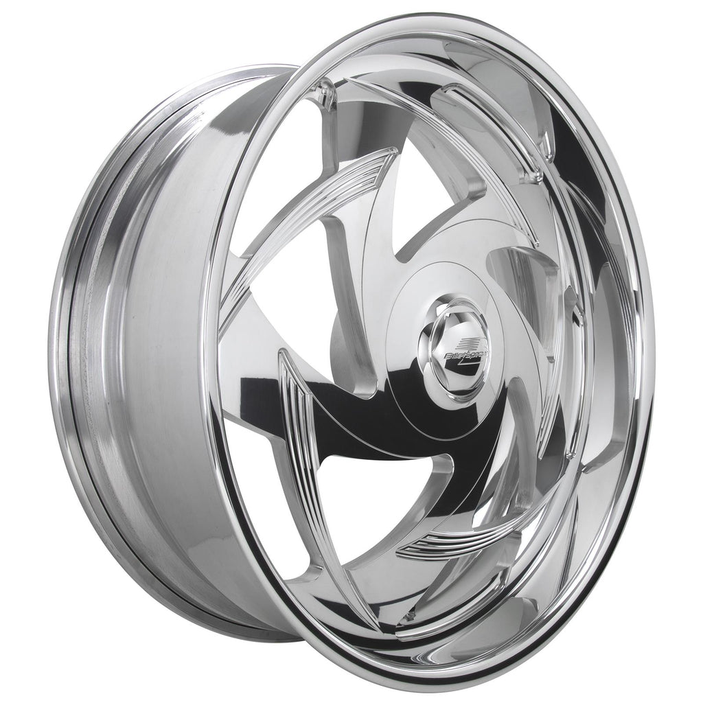Billet Specialties GS Series GS39 polished custom order big wheels make a bold statement of style that will separate your ride from the pack. Each 2-piece wheel is precision-machined from forged 6061 T-6 aluminum centers for light weight, and then mated to a spun 6061 one-piece conventional lip barrel for strength and trueness. GS39 rims feature five curved spokes with grooved crossover accents that create a sharp, swirling appearance; plus, a center hub designed for hidden lugs. These impactful wheels are available in a variety of size options for the front and/or rear or your vehicle.
