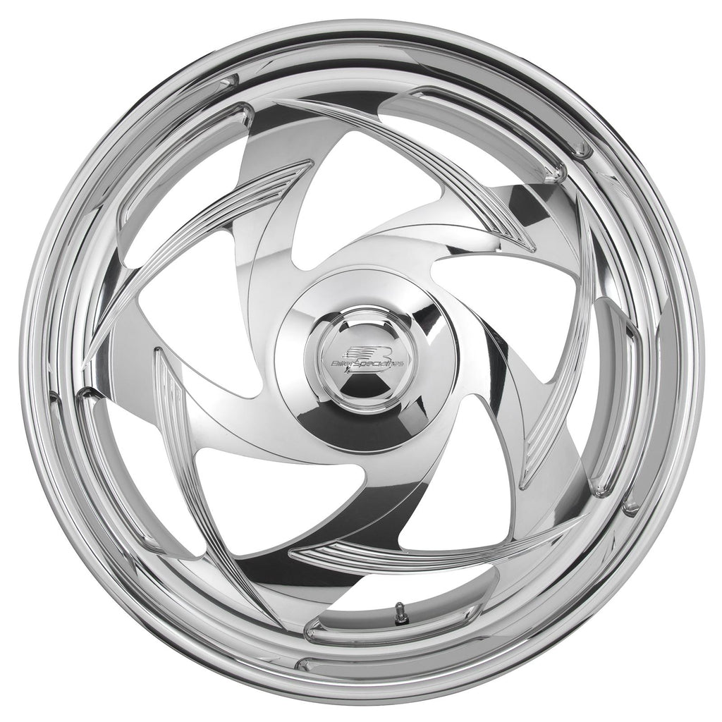 Billet Specialties GS Series GS39 polished custom order big wheels make a bold statement of style that will separate your ride from the pack. Each 2-piece wheel is precision-machined from forged 6061 T-6 aluminum centers for light weight, and then mated to a spun 6061 one-piece conventional lip barrel for strength and trueness. GS39 rims feature five curved spokes with grooved crossover accents that create a sharp, swirling appearance; plus, a center hub designed for hidden lugs. These impactful wheels are available in a variety of size options for the front and/or rear or your vehicle.