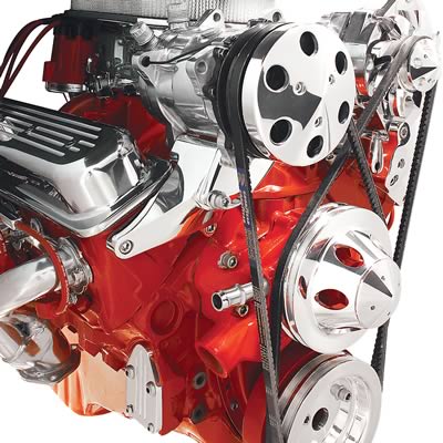 Notes: Mounts to the passenger side of the motor and positions the compressor to the inside of the passenger side valve cover. Designed to Vortec heads with short water pump and V-Belt pulley.